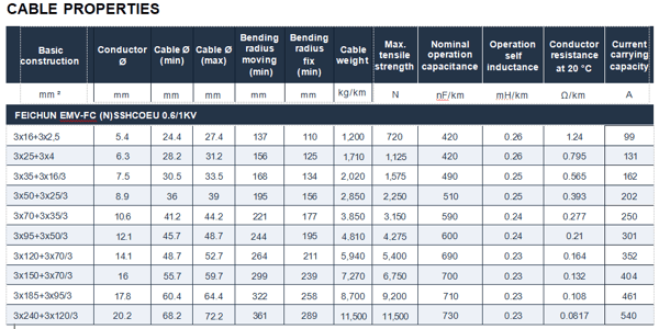 FEICHUN EMV-FC (N)SSHCOEU is designed for fixed installation and flexible operation in heavy mechanical stress environments, particularly as a motor power supply cable for Variable Frequency Drives (VFD) and Frequency Converter (FC) controlled drives. Used extensively in mining, construction, and similar industries, this cable withstands continuous movement such as on material handling equipment and cable booms. It is suitable for permanent immersion in wastewater up to 40 °C at depths of up to 500 meters.