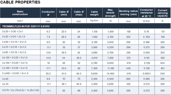 FEICHUN-M-PUR is a highly flexible low voltage reeling cable designed with optimized dimensions and a flame retardant, halogen-free polyurethane (PUR) outer sheath. It is primarily used as a power supply cable for underground mining and tunneling equipment, specifically engineered to endure frequently changing dynamic loads such as reeling operations on drilling machines, scoops, and LHDs. The cable offers superior resistance to mechanical stresses from reeling and abrasion typically encountered in trailing applications, ensuring durability and safety in harsh underground conditions.