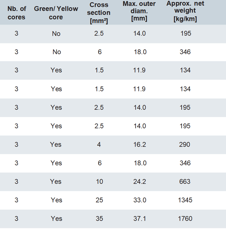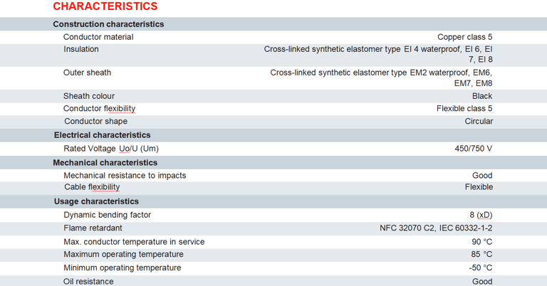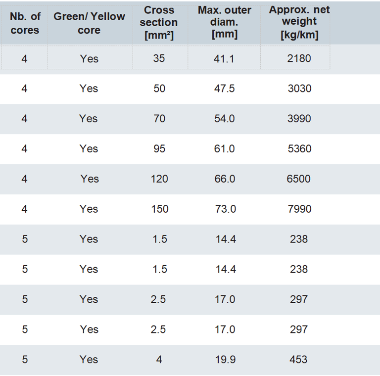 The insulation and sheathing combinations result in excellent flexibility and good robustness, therefore the product is recommended for use in power cables for port cranes, mobile machines on public building sites, professional portable tools, refrigerating installations, long-term heavy-duty applications in port areas, on ships, offshore platforms …
