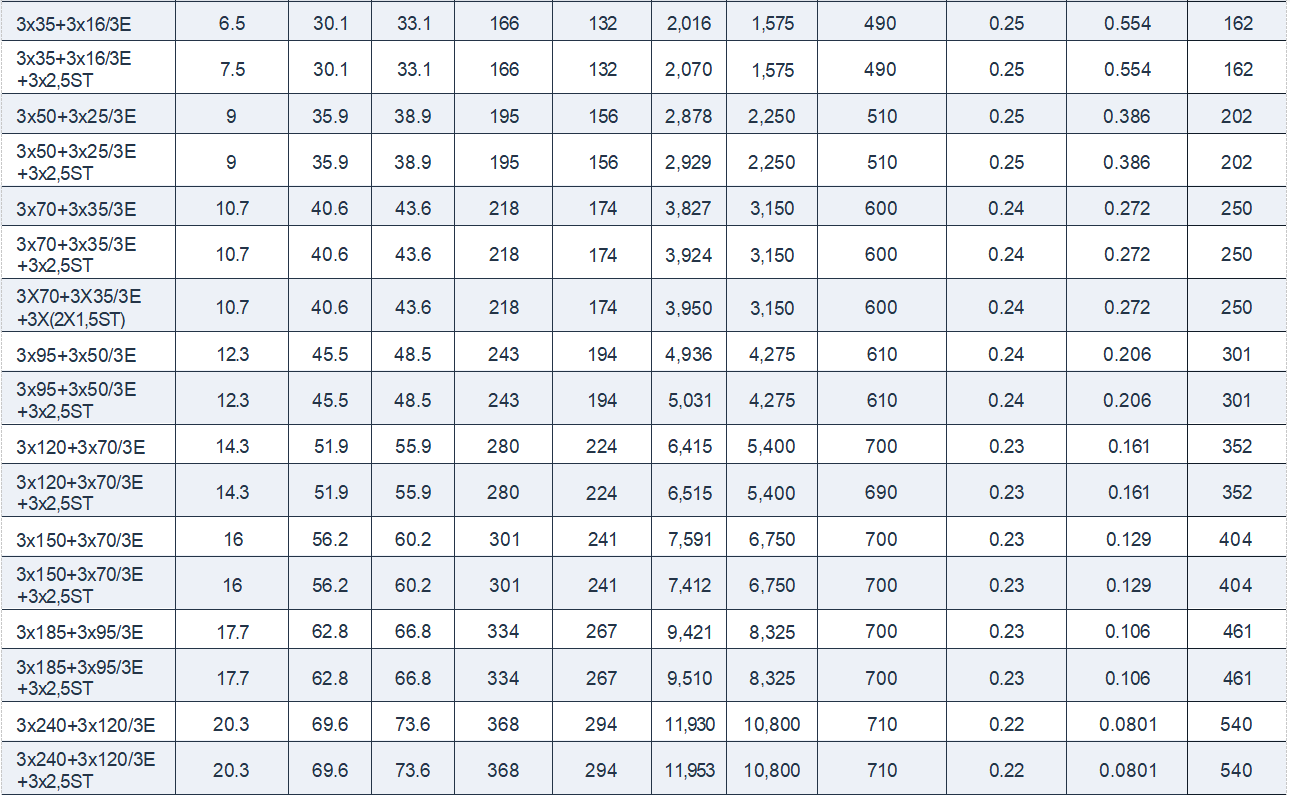 The cable construction achieves a balance between mechanical robustness and flexibility, with cable weights ranging from approximately 280 kg/km for the smallest configuration (3x1.5+3x1.5/3E) to 11,930 kg/km for the largest (3x240+3x120/3E). Maximum tensile strengths range from 68 N for small cables to 10,800 N for large cross-sections, accommodating the physical demands of installation and operation in mining environments.