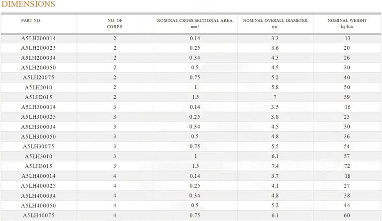 CHARACTERISTICS Voltage Rating 250/250V Temperature Rating Fixed: -40°C to +70°C Flexed: +5°C to +70°C Minimum Bending Radius Fixed: 7.5 x overall diameter |