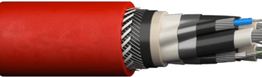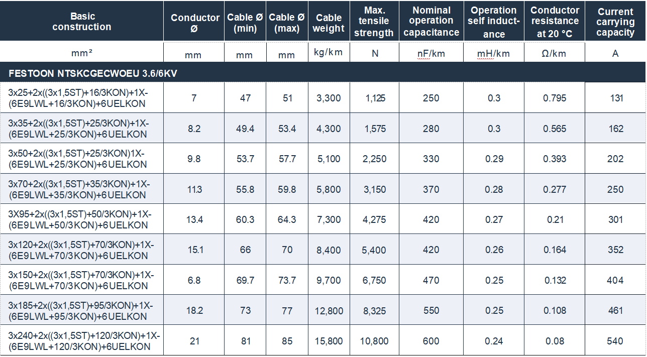 The conductor specifications reflect the cable's high-performance requirements. Finely stranded copper conductors in class 5 configuration, with tinning for corrosion protection, are available in cross-sections from 25 mm² to 240 mm². For example, a typical 3x50 configuration includes three 50 mm² main conductors (9.8 mm diameter each) plus control cores and integrated fiber optics, resulting in a complete cable diameter ranging from 53.7 mm to 57.7 mm depending on specific configuration.