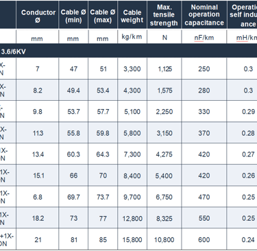 Insulation thickness varies with conductor size and voltage rating. The EPR PROTOLON 3GI3 compound provides insulation with excellent dielectric properties. At 3.6/6 KV rating, the nominal operation capacitance ranges from 250 to 640 nF/km depending on cable size, while operation self-inductance typically falls between 0.25 and 0.33 mH/km. Conductor resistance at 20°C varies from 0.795 Ω/km for 25 mm² conductors to 0.08 Ω/km for 240 mm² conductors, directly impacting voltage drop calculations for long feeder runs.