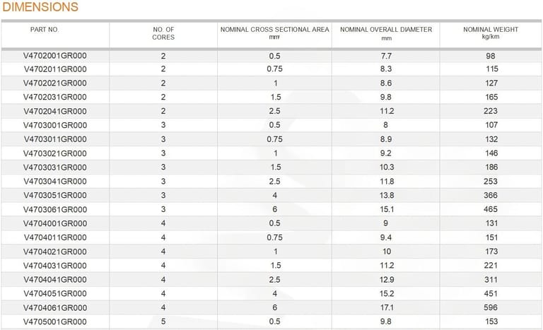 CHARACTERISTICS Voltage Rating Uo/U 300/500V Temperature Rating Fixed: -40ºC to +70ºC Installation: -5ºC to +70ºC Minimum Bending Radius Fixed: 4 x overall diameter Flexed: 10 x overall diameter |