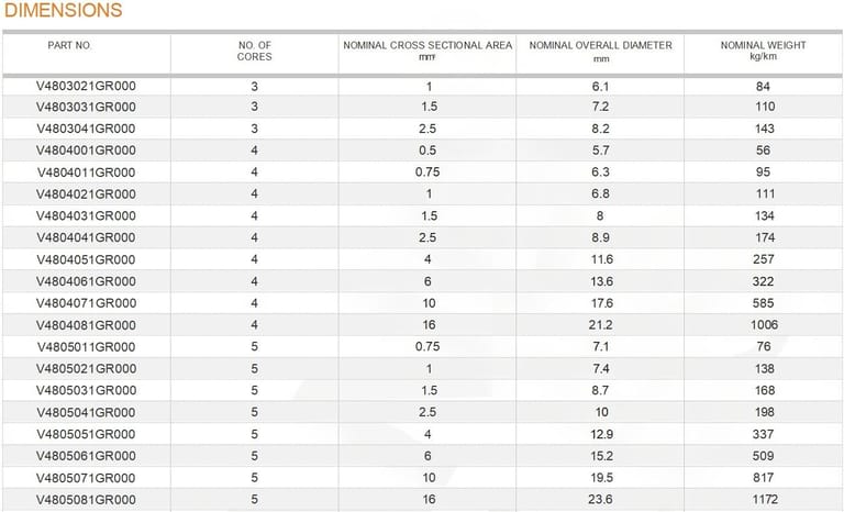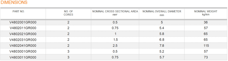 CHARACTERISTICS Voltage Rating Uo/U 300/500V Temperature Rating Fixed: -50ºC to +80ºC Installation: -40ºC to +80ºC Minimum Bending Radius Fixed: 4 x overall diameter Flexed: 7.5 x overall diameter |