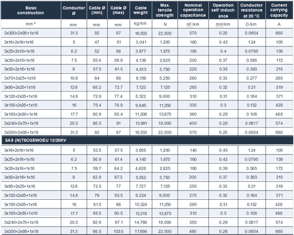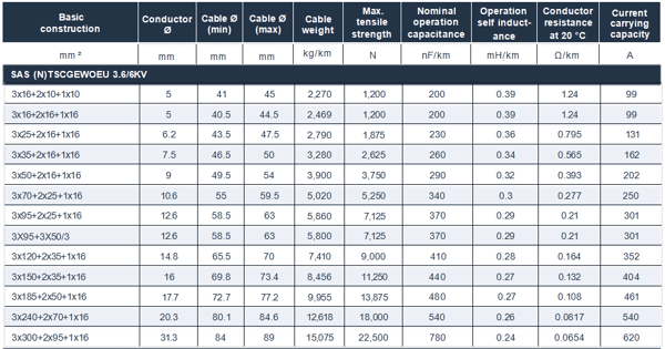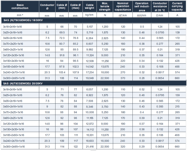 SAS (N)TSCGEWOEU is a robust medium voltage trailing cable designed as a power supply to large mobile equipment in mining operations, including shovels and draglines. Its outer sheath remains fully flexible down to –50 °C and offers exceptional resistance to abrasion, tearing, and mechanical stresses encountered during trailing and reeling applications in harsh environments.