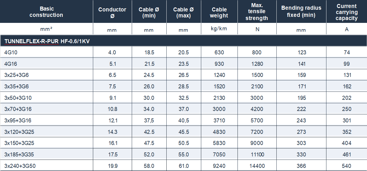 The TUNNELFLEX-R-PUR HF 1 kV cable with antitwisting protection represents a specialized solution for the demanding power requirements of mobile mining and tunneling equipment. Its key benefits include: