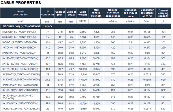 FEICHUN (VO) (N)TSKCGEWOEU cable is designed for power supply connections to mobile equipment and machines in underground mining applications, such as coal cutting machines. Intended for use in cable protection chains (cable handlers) that are trailed behind machines and absorb tensile forces during operation, this cable combines mechanical durability with high electrical performance and reliable monitoring features.